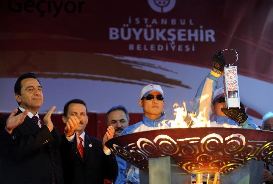 4月3日,在圣火传递终点――塔克希姆广场,护火手展示火种灯。当日,北京奥运会圣火境外传递第二站在土耳其伊斯坦布尔结束。
